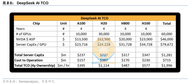 “实际上,DeepSeek的总体投资规模相当可观。”华泰证券指出,据SemiAnalysis估计,其GPU投资就超过5亿美元。考虑到服务器资本支出、运营成本等因素,DeepSeek的总拥有成本(TCO)在4年内可能达到25.73亿美元。