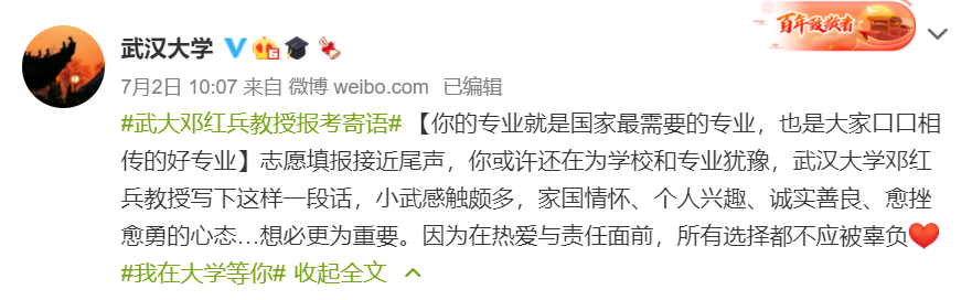 对此,邓红兵写下《致广大考生和家长的一封信》,并点评:“家国情怀、个人兴趣、诚实善良、愈挫愈勇的心态…想必更为重要。因为在热爱与责任面前,所有选择都不应被辜负。”